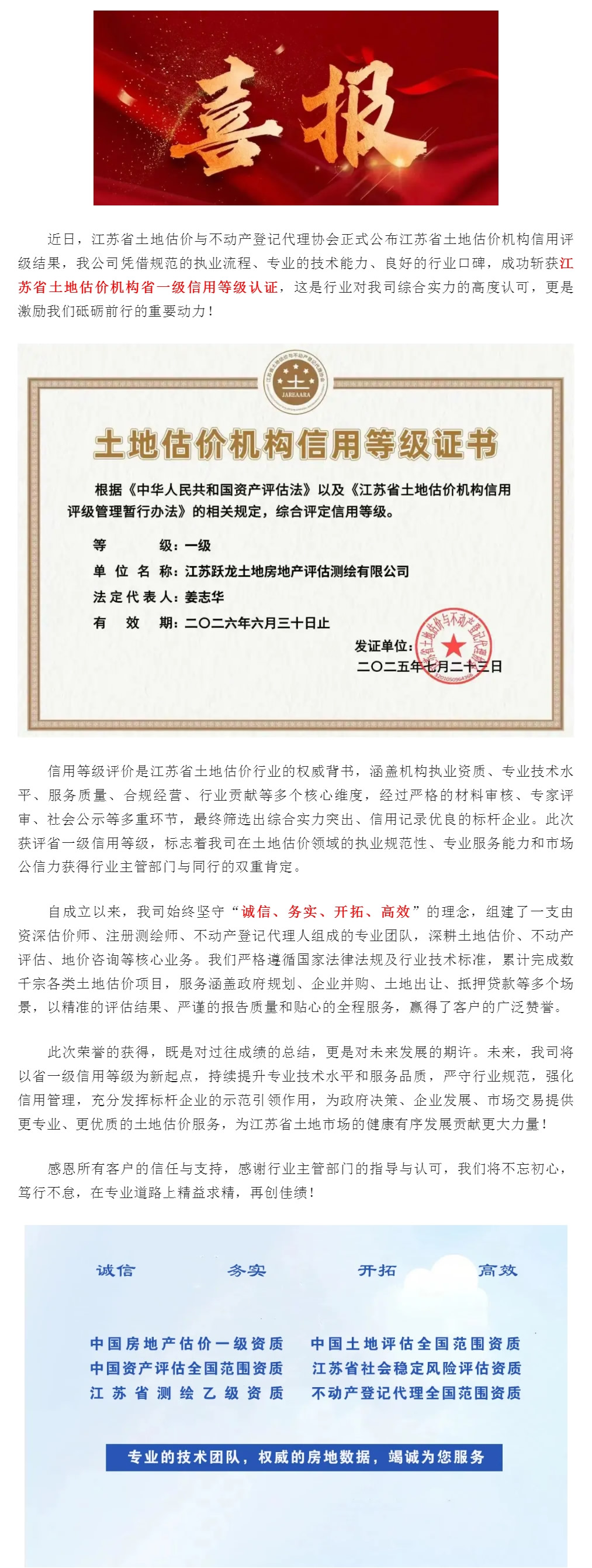 祝贺我司获得江苏省土地估价机构省一级信用等级