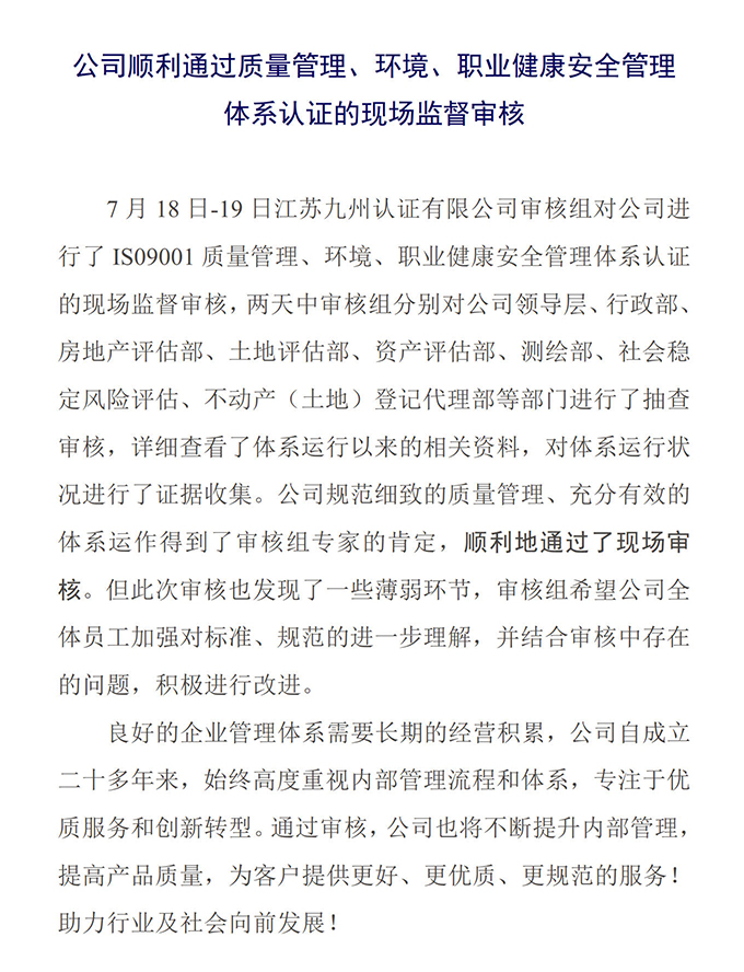 公司顺利通过质量管理、环境、职业健康安全管理体系认证的 现场监督审核